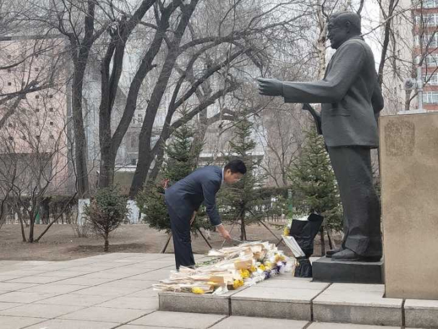全体成员怀着对马祖光院士崇高人格和伟大精神的崇敬与追忆,在马祖光院士雕塑前肃立默哀,并依次为马祖光院士敬献鲜花,由衷表达了对马祖光院士的深切悼念。