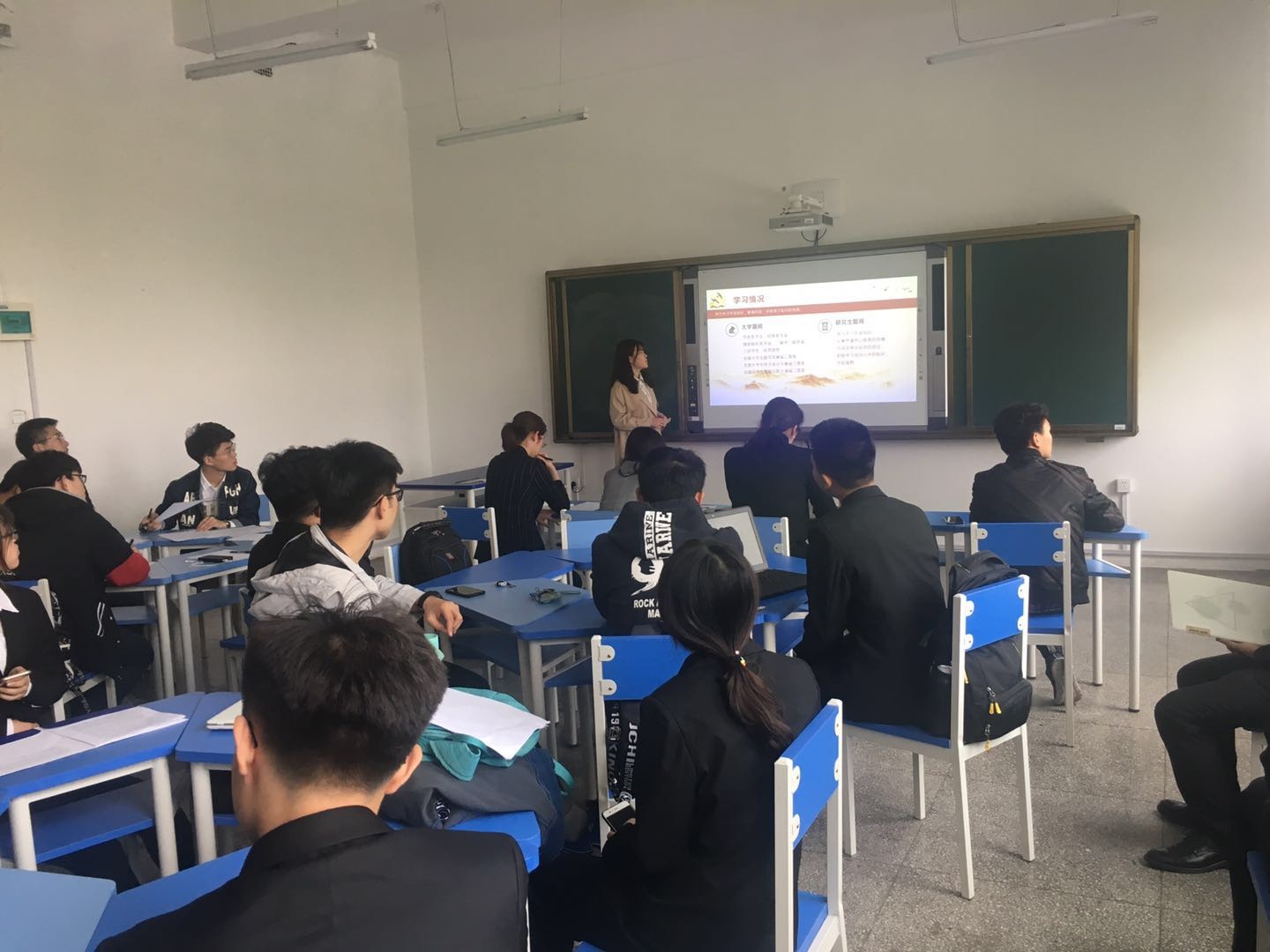 答辩过程中,21名参加答辩的同学依次上台讲述了自己包括学习成绩、奖惩情况、工作生活等方面的基本情况,表明了自己的入党动机和决心,并且分析了自己的优缺点,以及自己对未来的规划和展望。在每位同学讲述完后,评委们积极提问,从党的基本知识到政治时事,从生活作风到工作表现,从各个方面对参加答辩的同学进行考核,同时对他们的不足之处及时指出,帮助大家端正态度,明确目标。