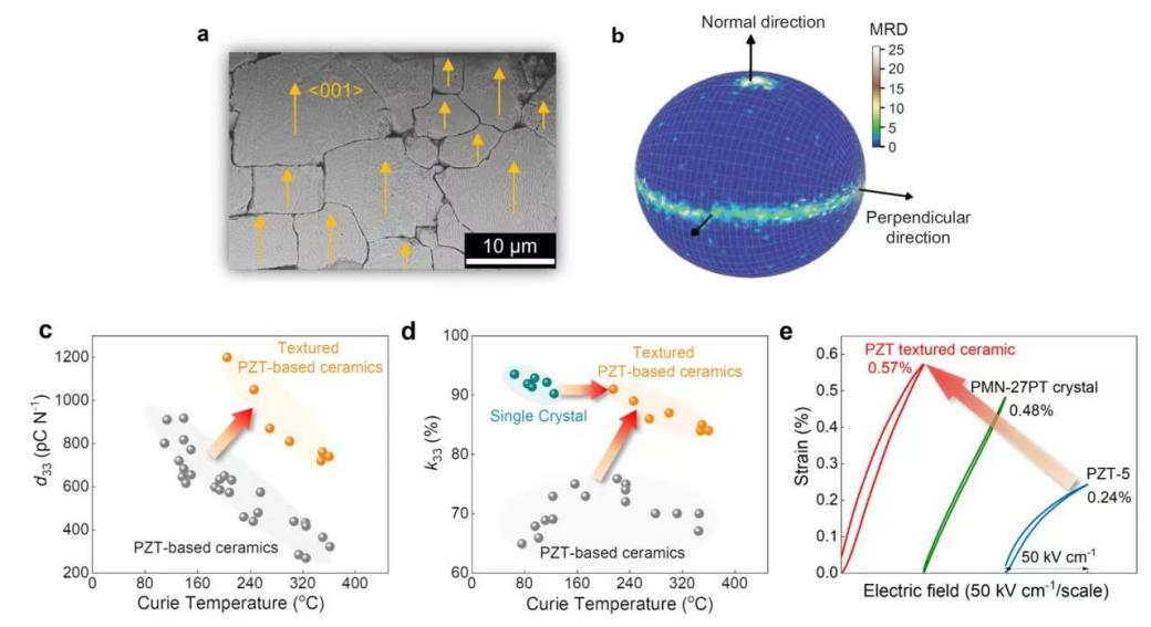 基于上述方法,研究团队解决了几十年来PZT陶瓷无法被高质量织构化的学术难题,首次制备出了晶粒沿<001>高度择优取向的PZT织构陶瓷(图1a&b),在准同型相界附近获得了优异的压电、机电耦合性能(压电系数d33~700 pC/N、g33~90mV·m/N、机电耦合系数k33~0.85)和良好的温度稳定性(居里温度~360℃),突破了现有PZT陶瓷压电效应与居里温度的制约关系(图1c)。本研究为先进陶瓷的织构化工作提供了一种新思路,研制出的高性能PZT织构陶瓷不但为高灵敏度传感器、换能器的性能提升带来了新的契机,同时也为研究PZT这类经典铁电体结构与性能关系提供了重要的基础材料。