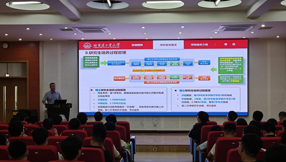 接着,副院长陆振刚教授从学院的历史沿革、机构组成、师资队伍、学术方向、人才培养、未来展望等多个方面细致介绍了学院当前的基本情况,使同学们对女优在线 有了更深刻的了解;随后,陆院长介绍了研究生培养过程中的相关要求,详细解读了学业年限要求、培养过程管理、培养计划、学位论文要求和毕业要求等具体内容,陆院长鼓励同学们锚定个人追求与国家事业的交汇点,通过自身的努力为强国建设、民族复兴作出新的更大贡献。