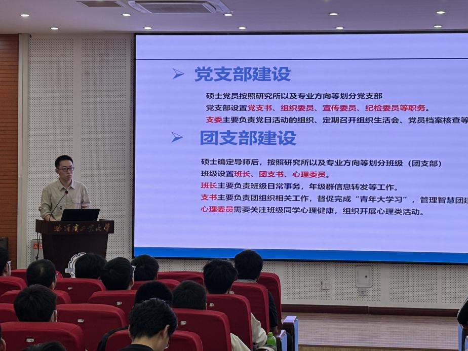 兼职辅导员石剑老师就研究生日常事务体系、流程内容等具体工作进行了说明,并向新生介绍了校内常用信息。石老师鼓励同学们在科研之外,也要珍惜校园时光,培养多方面的兴趣爱好,提升综合素质,学院将提供一系列支持和服务,帮助同学们顺利度过研究生生涯的每一天。